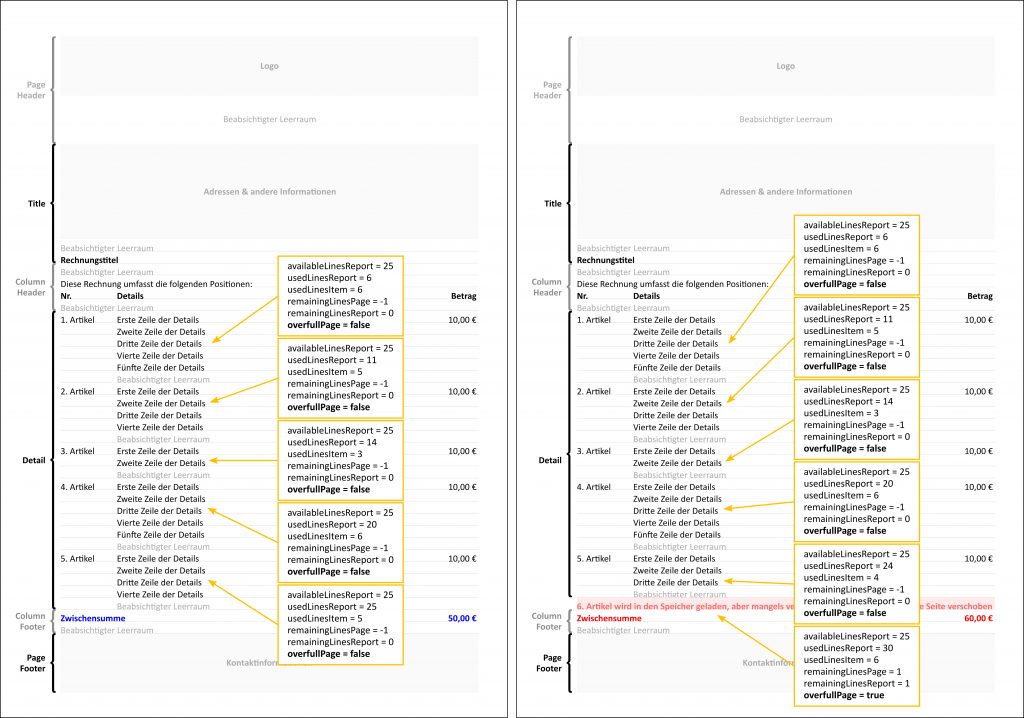Anstelle eines weiteren langen Absatzes über die Werte, die die Variablen in verschiedenen Situationen haben, werden die Beispielgrafiken aus dem ersten Teil dieses Beitrags erneut verwendet und zeigen nun auch die Variablenwerte in Anmerkungen. Wie man sehen kann, hat die overfullPage Variable nur für den letzten Eintrag auf einer Seite den Wert true, wenn dieser auf die nächste Seite verschoben werden musste. Die Variable kann daher verwendet werden, um zu entscheiden, ob subtotal_incl oder subtotal_excl den korrekten Wert für die Zwischensumme enthält.