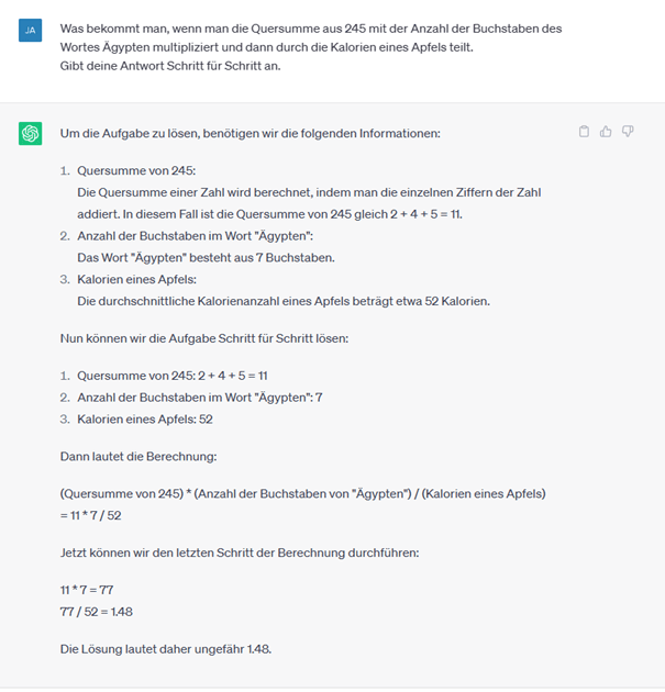 Abbildung 2: Beispiel für die Vorteile eines Chain-of-Tought Prompts. Ohne die Zwischenschritte kann das LLM die Aufgabe nicht lösen.