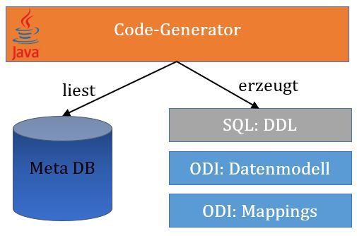In unserem Projekt sollte aber keine Software hinzugekauft werden, sondern eine eigene Version eines Generators geschrieben und implementiert werden. Die Grundvoraussetzungen existierten bereits: Der ODI wurde im Projekt schon verwendet, große Teile der Software des Projekts sind in Java geschrieben und über die ODI API ließ sich beides nahtlos verbinden, da diese API ebenfalls Java bzw. Groovy verwendet.