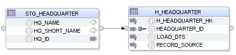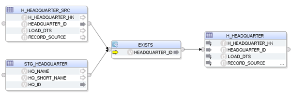 Hierbei wird der HEADQUARTER-Hub mit den HEADQUARTERs aus der Quelle gejoint und somit neue Einträge ermittelt. Allerdings ist man durch die jeweils verwendeten Business Keys nicht sehr flexibel und es müsste in diesem Fall jedes Mal die EXISTS-Komponente dynamisch angepasst werden.