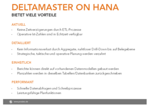 Es wurde aber auch geklärt, was HANA eigentlich ist. HANA ist nämlich nicht nur eine Datenbank, sondern bietet ein Echtzeit-Reporting durch „Calculation Views“, mit direktem Durchgriff auf die operativen Daten. Für den DeltaMaster on HANA ergeben sich dadurch viele Vorteile: