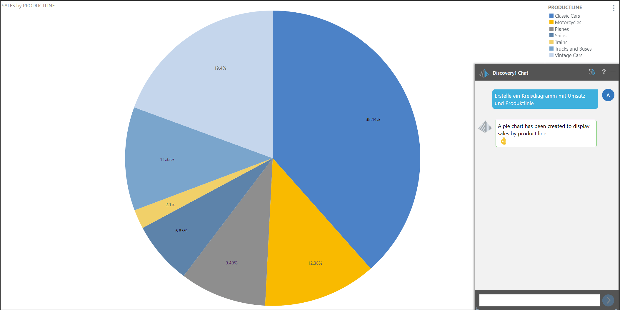 4. Analog dazu erstellen wir ein Kreisdiagramm mit folgendem Befehl „Erstelle ein Kreisdiagramm mit Umsatz und Produktlinie“