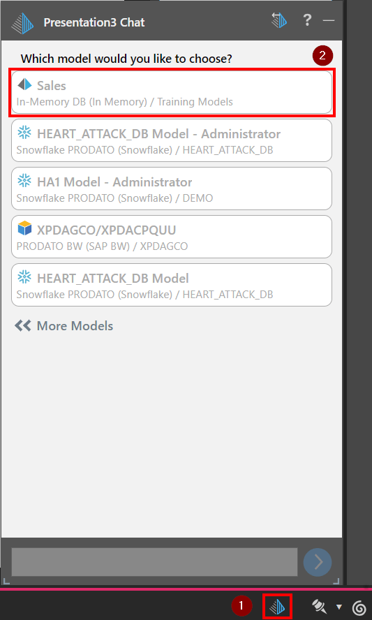 1. Um ein Dashboard mit Hilfe des Chatbots zu erstellen, öffne ein neues Present-Fenster und klicke auf das Pyramid Symbol unten rechts im Fenster. ähle anschließend eine geeignete Datenbank aus.