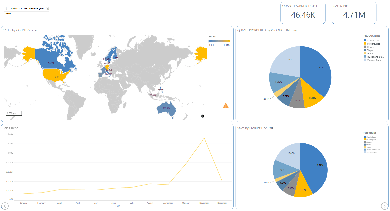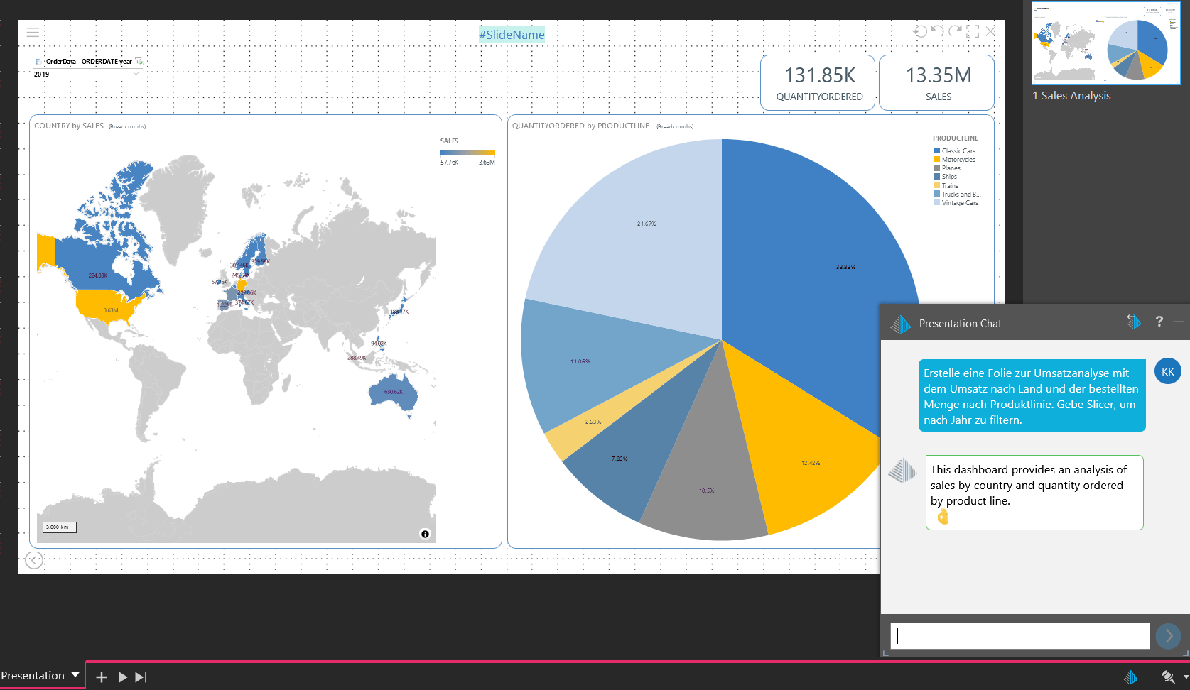 2. Schreibe in die Eingabeaufforderung einen Befehl, wie „Erstelle eine Folie zur Umsatzanalyse mit dem Umsatz nach Land und der bestellten Menge nach Produktlinie. Füge Slicer hinzu, um nach Jahr zu filtern“. Nun wurden die hier zu sehenden Grafiken, KPIs und Filter automatisch innerhalb von Sekunden erstellt.
