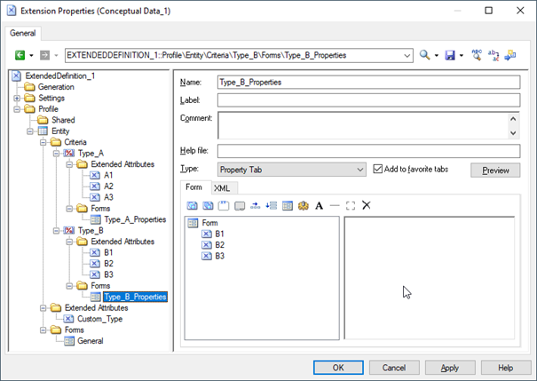 Als nächstes legen wir unterhalb des Criterion Type_A ein weiteres Formular an, das wir Type_A_Properties nennen. Bei ‚Type‘ lassen wir in diesem Fall die Standardeinstellung ‚Property Tab‘ unverändert. Im Formular fügen wir die Extended Attributes A1, A2 und A3 ein, die genau dann konfiguriert werden sollen, wenn unser Custom_Type gleich A ist.