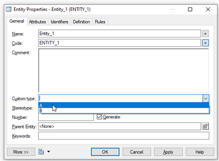 Rufen wir jetzt das Eigenschaften-Menü einer Entität auf, so können wir direkt im Reiter ‚General‘ den Custom_Type über eine Dropdown-Liste konfigurieren: