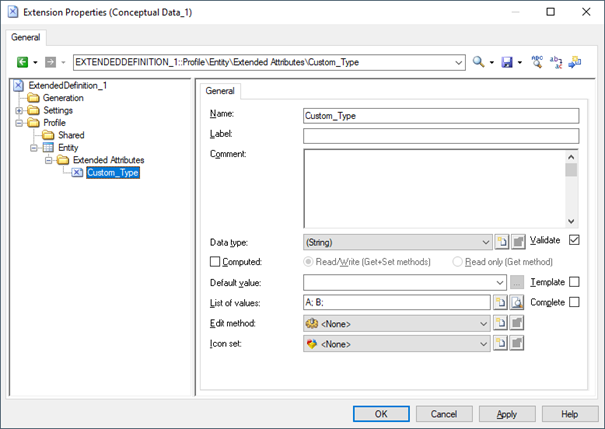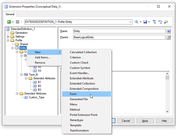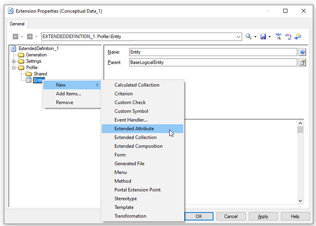 Nachdem wir nun alle zusätzlichen Metadaten-Eigenschaften mittels Extended Attributes angelegt haben, müssen wir noch dafür sorgen, dass diese auch im Eigenschaften-Menü für die Entitäten im Conceptual Data Model angezeigt werden.