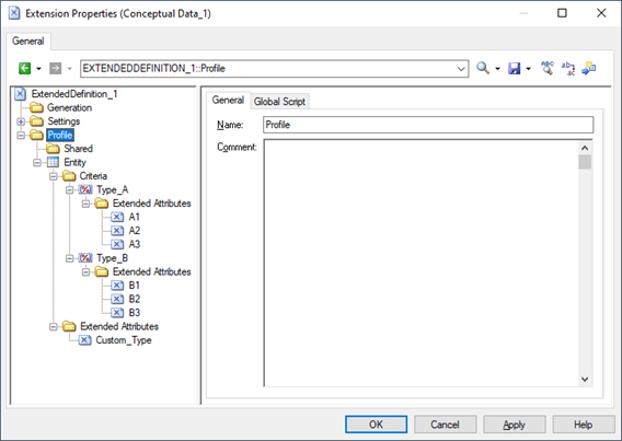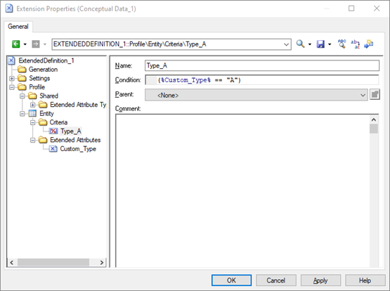 Als nächstes legen wir drei weitere Extended Attributes an, die angezeigt werden sollen, wenn Custom_Type den Wert A hat. Wir führen dazu einen Rechtsklick auf unser Criterion Type_A aus, wählen ‚New >‘ und anschließend ‚Extended Attribute‘. Dadurch wird dieses unterhalb von Type_A angelegt. Wir vergeben den Namen A1 und wählen als Datentyp Integer. Wir wiederholen diesen Schritt und legen so noch zwei weitere Extended Attributes A2 und A3 mit beliebigen Datentypen unterhalb von Type_A an.