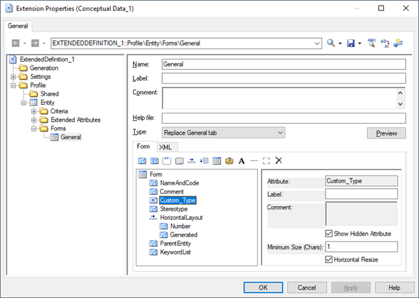 In diesem neuen Formular wählen wir bei ‚Type‘ die Option ‚Replace General tab‘ und fügen unterhalb von ‚Comment‘ unser Extended Attribute Custom_Type ein. Dadurch kann diese Eigenschaft ab sofort im Reiter ‚General‘ des Eigenschaften-Menüs konfiguriert werden: