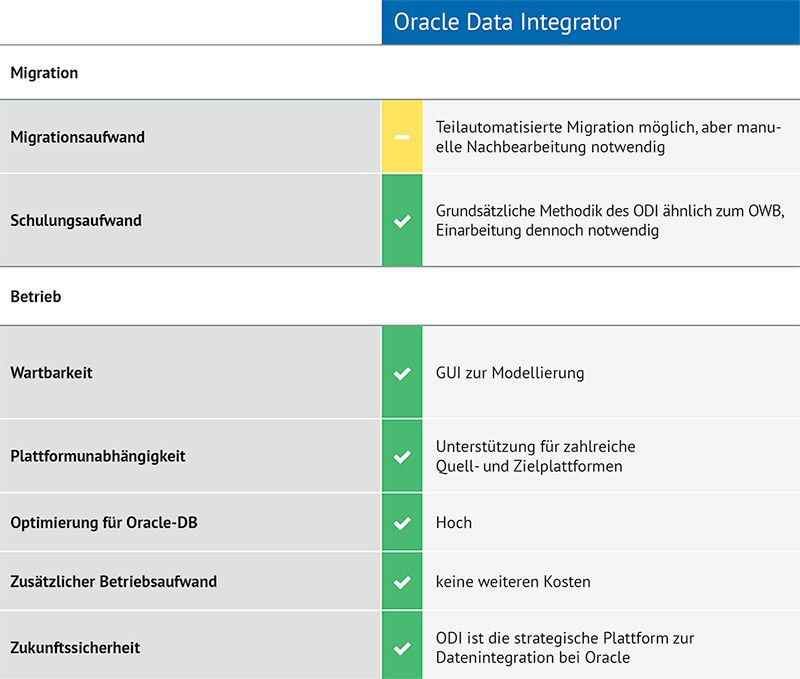 Die eigentliche Migration des OWB-Projekts zum ODI wird von Oracle recht gut unterstützt. Der ODI hat im Laufe der letzten Jahre viele Funktionen des Warehouse Builders erhalten, so dass größere Teile der Importlogik direkt abgebildet werden. Außerdem gibt es von Oracle ein Migrationstool, dass automatisch die OWB-Mappings in den ODI übernimmt und damit viel Zeit einspart.