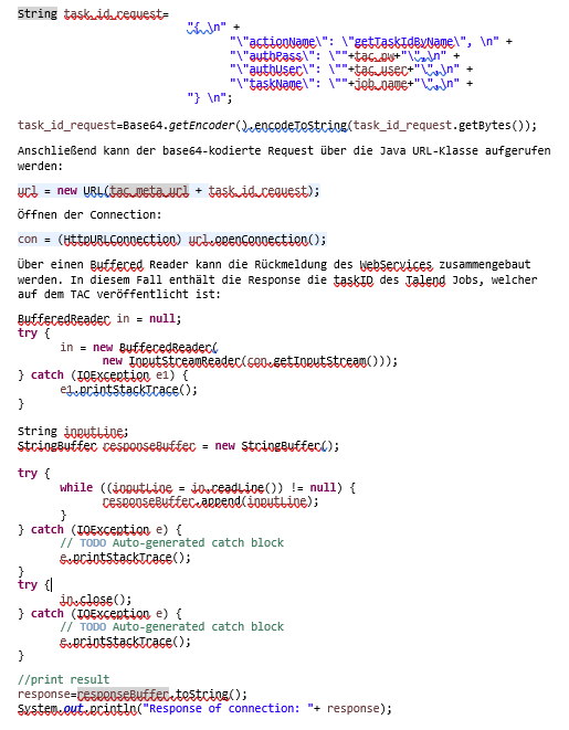 Für den Aufruf eines Talend Jobs wird die TaskID, welche vom System beim Deployen auf dem TAC generiert wird, benötigt. Soll der Talend Job programmatisch ausgeführt werden dann kann dazu die Methode getTaskIdByName aufgerufen werden.