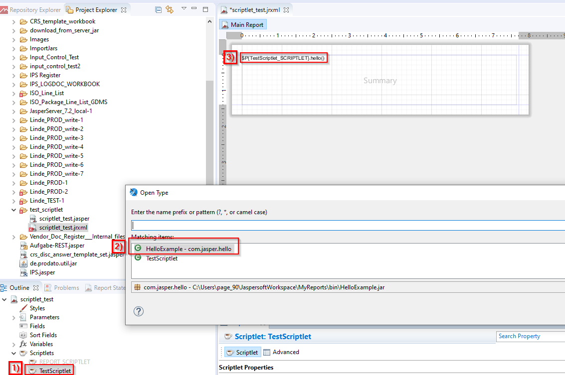 Zunächst wird ein einfaches Scriptlet-Beispiel gezeigt, mit welchem ein String im Summary-Band des Berichts angedruckt werden kann. Für die Erstellung des Scriptlets empfiehlt sich Eclipse als Java Editor. Weiterhin wird die JasperServer jar aus der Installation des JasperServers benötigt. In diesem Beispiel ist der jasperreports-server 6.4.2 installiert.