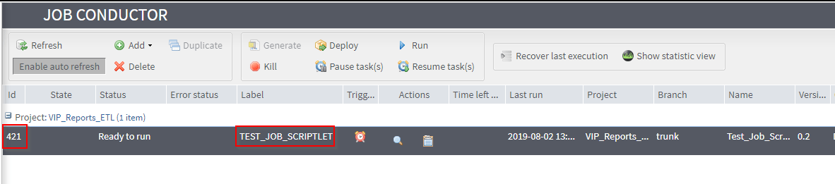Die TaskID des Beispiel Talend Jobs kann im TAC unter den Spalten im Job Conductor eingesehen werden. Für den Talend Job TEST_JOB_SCRIPTLET ist die ID 421.
