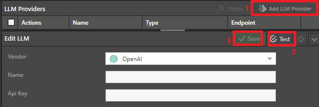 - Wähle „Add LLM Provider“ aus. Als nächstes füge „Name“ und den zuvor erstellten „Api Key“ hinzu. Wähle „Test“, um die Verbindung zu testen. Wenn der Test erfolgreich war und die Verbindung hergestellt werden konnte, klicke auf „Save“ um die Einstellungen zu speichern.
