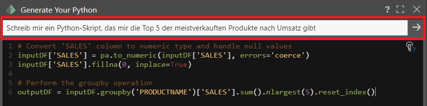 - Um eine Python Script mit ChatGPT zu erstellen, schreibe einen Prompt, wie „Schreib mir ein Python-Skript, das mir die Top 5 der meistverkauften Produkte nach Umsatz gibt“. Man kann den Prompt auf Deutsch, Englisch oder einer anderen Sprache verfassen. Sie werden vom Chatbot korrekt interpretiert.