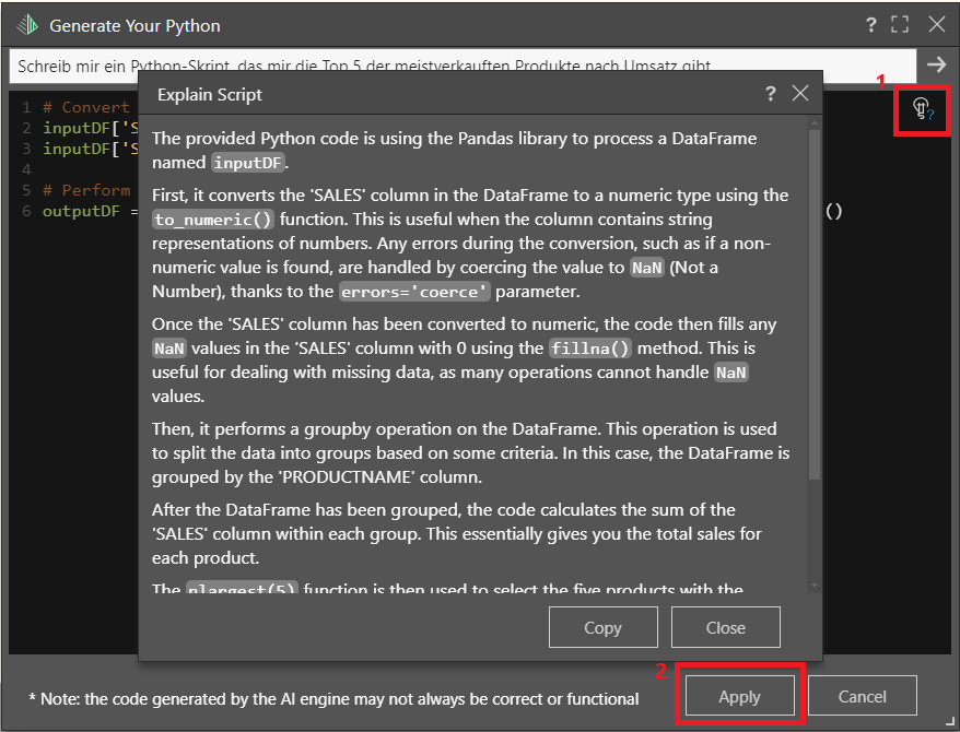 - Um das Skript besser zu verstehen, kann durch ChatGPT auch der Code erklärt werden. Klicke dafür auf das Glühbirnensymbol. Anschließend kann das Skript gegebenenfalls noch angepasst werden. Wenn alle Einstellungen vorgenommen wurden, bestätige diese mit dem „Apply“ Button.