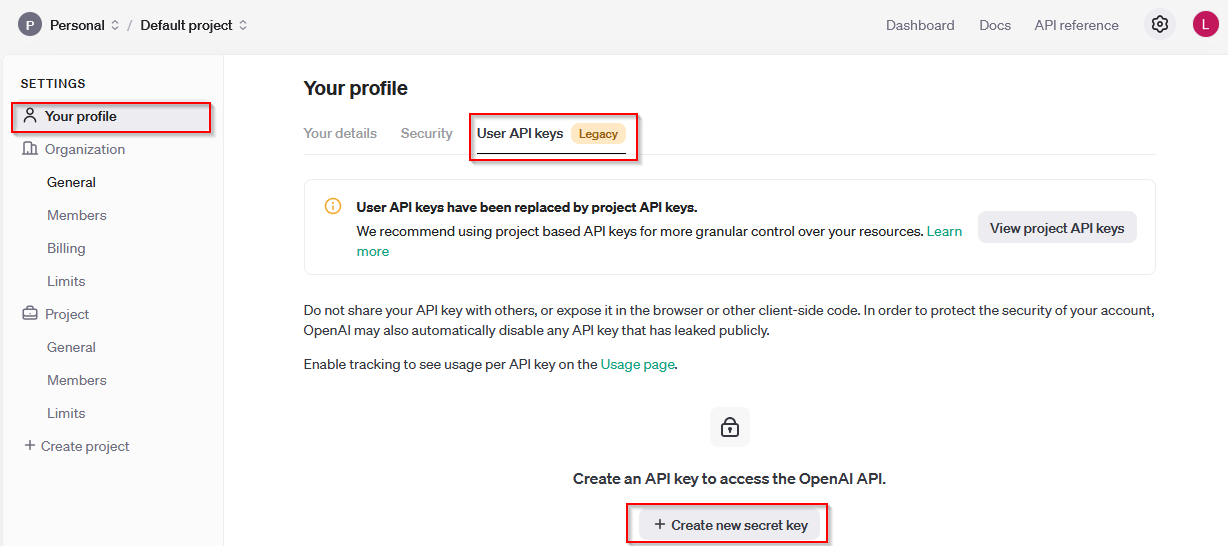 - Zum Erstellen eines API Keys, gehe in dein Profil herein „Your Profile“ und öffne den „User API Keys“ Tab. Klicke anschließend auf „Create new secret key“.
