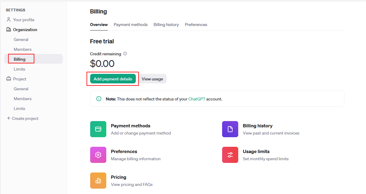 - Der OpenAI-Kontotyp kann für eine Privatperson oder eine Firma festgelegt werden. Um den entsprechenden Kontotyp auszuwählen, klicke auf „Settings“ > „Billing“ > „Add payment details“.