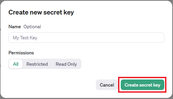 - API Keys können umbenannt und entsprechende Berechtigungen können festgelegt werden. Nachdem die für dich zutreffenden Einstellungen vorgenommen wurden, klicke auf „Create secret key“.