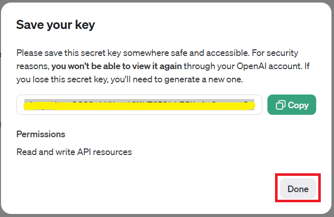 - Speichere den Schlüssel an einem sicheren Ort. Dieser Schlüssel wird nur einmalig generiert. Eine erneutes Anzeigen ist nicht möglich.