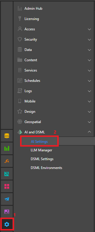 - Um den in OpenAI generierten Schlüssel in Pyramid Analytics zu verwenden, melde dich als Enterprise Admin in deiner Instanz an und gehe in die Admin Einstellungen unter AI Settings.