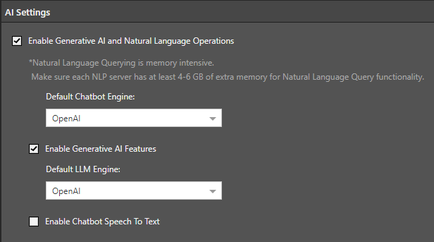 - Da wir in diesem Beispiel einen OpenAI basierten Chatbot zeigen, muss standardmäßig OpenAI in der Chatbot und LLM (Large Language Model) Engine ausgewählt werden.