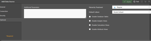Keytab kommuniziert sicher zwischen den Servern. Hier kann ein Kerberos Keytab File hinzugefügt werden und sich anschließend mit einem User angemeldet werden. Die Keytab Authentifizierung ist aktuell nur für ein paar Datenquellen, wie SAP HANA oder Denodo möglich.Bei der Authentifizierungsmethode Application Authentication meldet ihr euch mit einem User auf der Datenbank an. Hierbei empfehlen wir für die Verbindung einen dedizierten User auf der Datenbank mit den benötigten Berechtigungen auf Tabellen zu nutzen.Es gibt noch eine weitere Methode namens SAML. Diese wird jedoch nur an dieser Stelle angezeigt, wenn man SAML im Authentificationsprovider bereits angebunden hat. Dies kann in der Admin Konsole unter Access >Authentification gefunden werden. Für Provider kann anschließend “SAML” ausgewählt werden. - Es können weitere Parameter festgelegt werden, wie Hierarchien, die default Sprache, oder ob bestimmte HANA-Objekte für den User sichtbar sind.