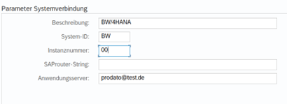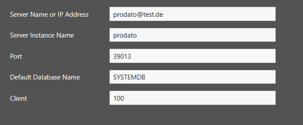 - Die Server Informationen müssen in die jeweiligen Felder eingepflegt werden. die benötigten Verbindungsdaten können entweder im SAP Logon nachgeschaut oder beim zuständigen Admin erfragt werden. Unter Connection wird die IP-Adresse und der Instanz Name eingegeben. Die angegebene Port Nummer ist die Standardnummer, diese kann von echten Anmeldedaten abweichen.