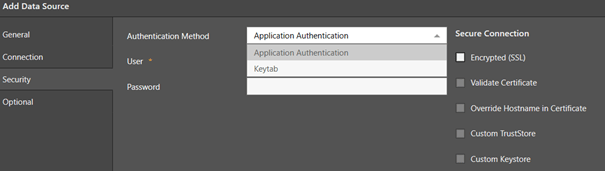 - Im Reiter Security gibt es zwei verschiedene Authentifizierungsmethoden: Keytab oder Application Authentication entscheiden Sie sich für die Methode, die für Sie am besten passt.