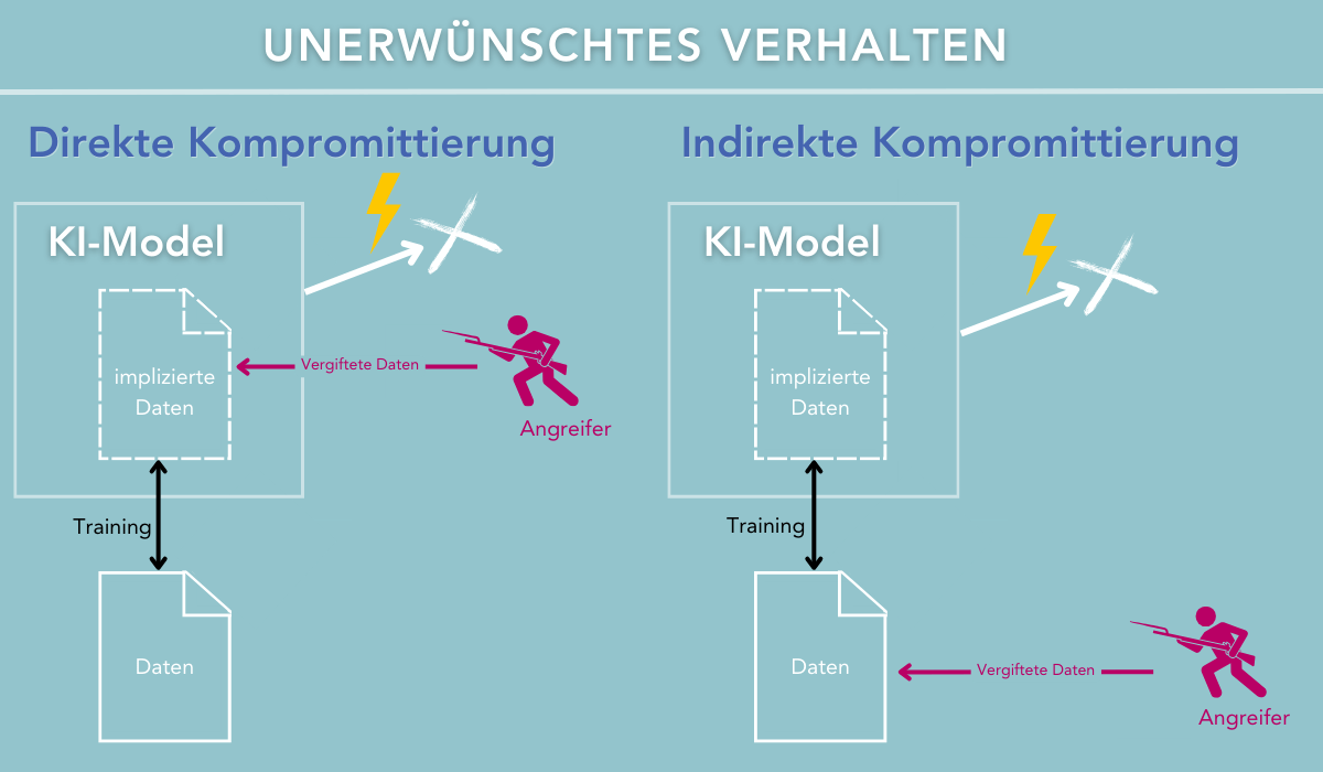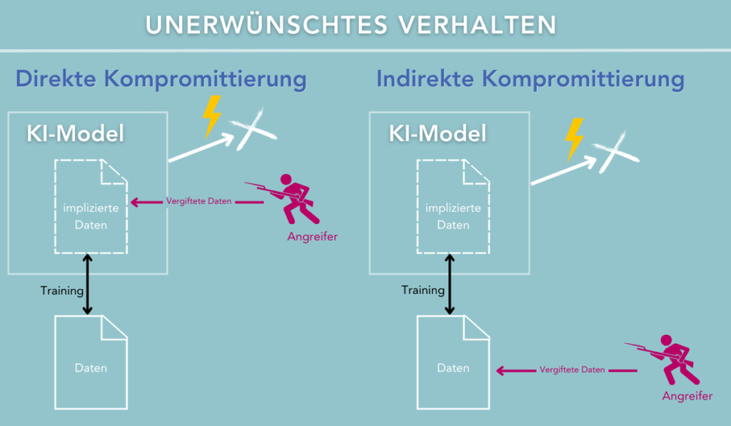 Ein Angriff kann direkt auf das Modell erfolgen, oder die (bekannten) Trainingsdaten können vergiftet werden, um Hintertüren oder (Fehl-)Verhalten in das System zu induzieren. Dies kann ohne direkten Zugriff auf das KI-System durchgeführt werden und stellt einen vollkommen neuen Angriffsvektor dar. Das Ziel ist das System zu kompromittieren und so global oder temporär Fehlverhalten zu induzieren und somit im extremen Fall das Modell unbrauchbar zu machen, oder das Vertrauen in das KI-System zu zerstören.