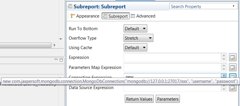 new com.jaspersoft.mongodb.connection.MongoDbConnection(“mongodb://127.0.0.1:27017/xxx”, “username”, “password”)